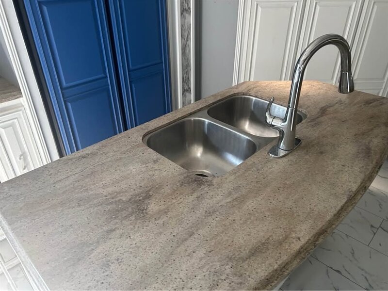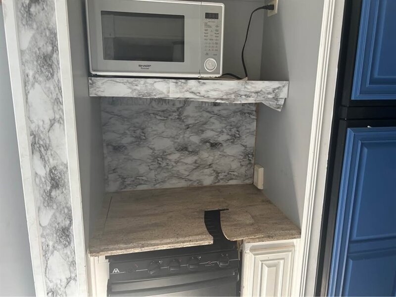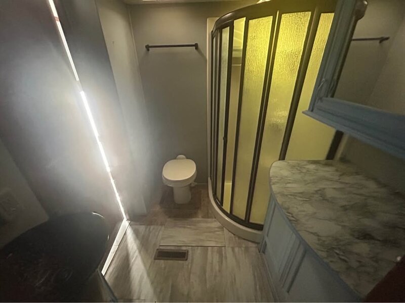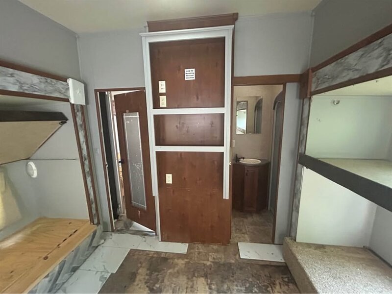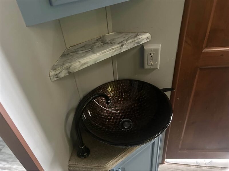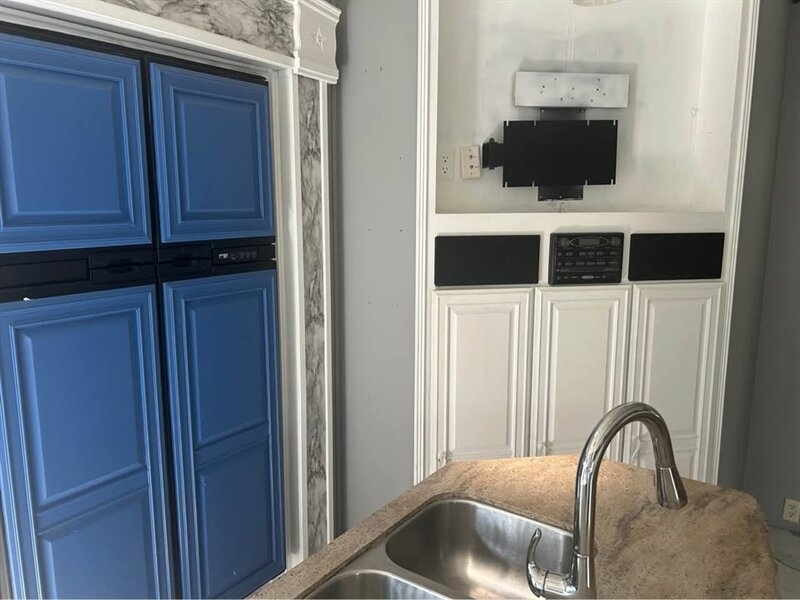 The main living area boasts residential-style furnishings, a large entertainment center, and a fully equipped kitchen with solid surface countertops, abundant cabinetry, and modern appliances. The master suite includes a comfortable queen bed, generous closet space, and direct access to a spacious bathroom.