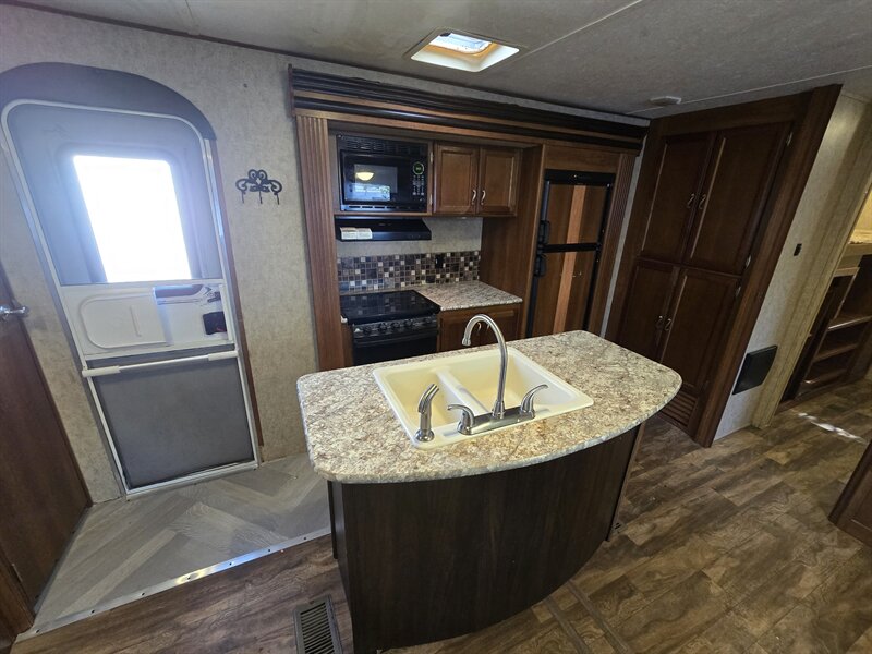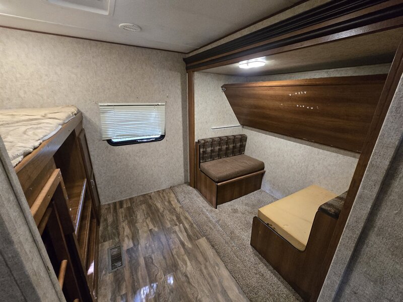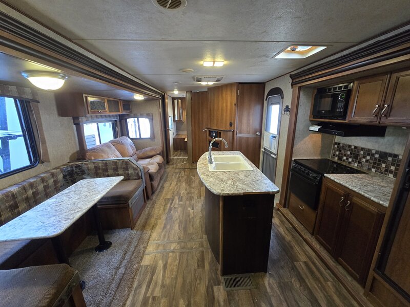 Inside, you’ll find a private rear bunk room that offers excellent space for kids or guests, along with a large slide-out in the main living area that creates an open and inviting atmosphere. The kitchen is fully equipped with a refrigerator, stove, oven, microwave, and ample cabinet storage, making meal prep easy whether you’re at the campground or off-grid.